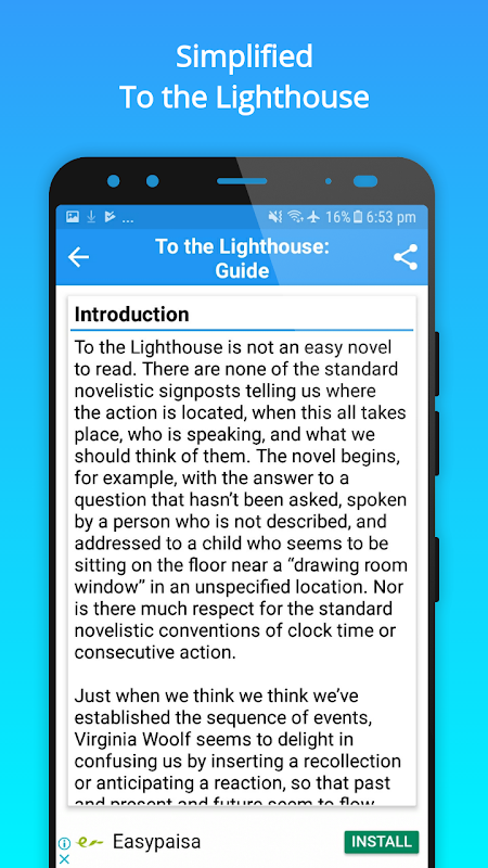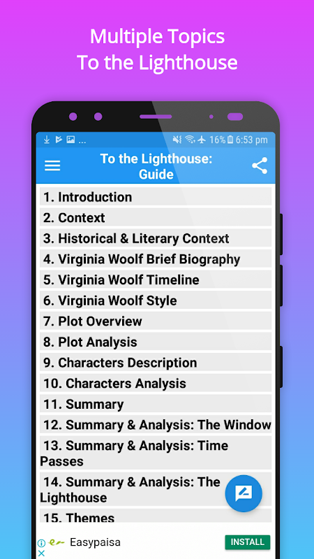 This Guide app works both online and offline, and contains 32 basic topics about one of the famous novels of Virginia Woolf, To the Lighthouse.