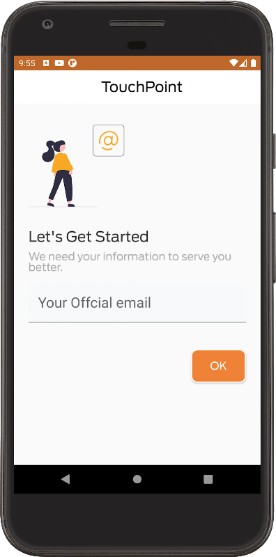 এমপ্লয়িজ তাদের স্মার্ট ফোনে টাচপয়েন্ট অ্যাপ্লিকেশন ডাউনলোড করুন এবং তাদের বিবরণ নিবন্ধন করতে পারেন। একটি OTP উত্পন্ন & আপনার মোবাইল থেকে পাঠানো আপনি অ্যাপ মধ্যে অ্যাক্সেস তৈরি ও আপনার কলকব্জা পরিচালনা করতে দেয়।
