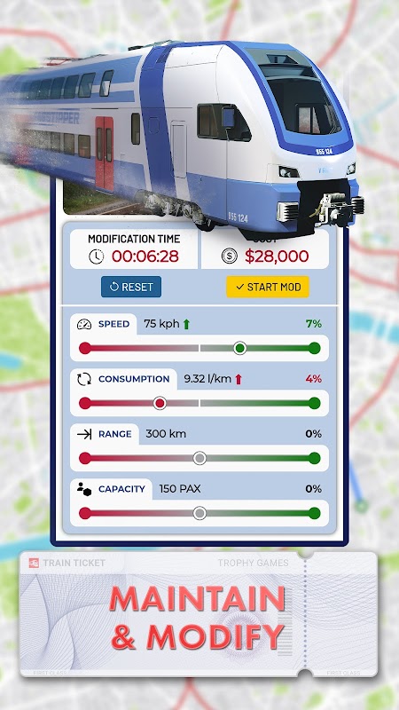 ট্রেন কার কাস্টমাইজেশন: আপনার যাত্রীদের চাহিদা পূরণ করতে প্রতিটি গাড়ি আপগ্রেড করুন এবং টিকিটের দাম, গতি, খরচ, পরিসর এবং ক্ষমতা সামঞ্জস্য করুন।