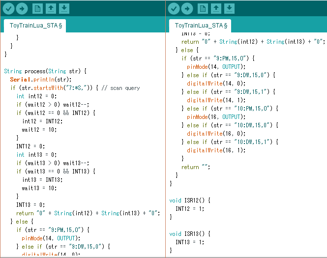 活用法1で使ったスクリプト言語Luaのスクリプトで、そのまま実物の電車玩具の走行を自動制御できるのです。
