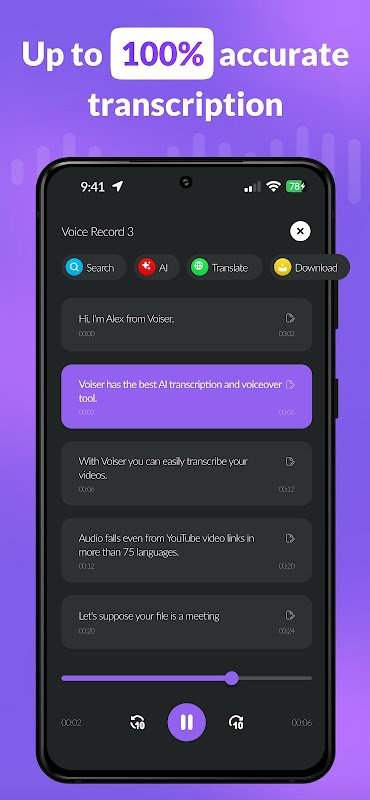 যে ব্যক্তিদের একটি দক্ষ ভয়েস টাইপিং অ্যাপের প্রয়োজন তাদের জন্য, Voiser AI টেক্সট প্রযুক্তিতে AI-চালিত স্পিচের সেরাটি নিয়ে আসে। আপনি আপনার ধারনা নির্দেশ করছেন বা কথ্য শব্দগুলিকে লিখিত আকারে রূপান্তর করছেন না কেন, Voiser AI সর্বাধিক সুবিধার জন্য একটি স্বজ্ঞাত ইন্টারফেস প্রদান করে। স্পিচ টু টেক্সট অ্যাপ নিশ্চিত করে যে আপনি কখনই গুরুত্বপূর্ণ কথোপকথন হারাবেন না, যখন ট্রান্সক্রিবার মেশিন লার্নিং ব্যবহার করে ক্রমাগত নির্ভুলতা উন্নত করে।