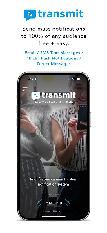 ট্রান্সমিট আমাদের বিপ্লবী 4-ইন-1 মেসেজিং সিস্টেম ব্যবহার করে 100% যেকোন শ্রোতাকে গণ বিজ্ঞপ্তি পাঠানো বিনামূল্যে + সহজ করে তোলে যা আপনাকে একটি একক বার্তা পাঠাতে দেয়, যা এর মাধ্যমে বিতরণ করা হয়: