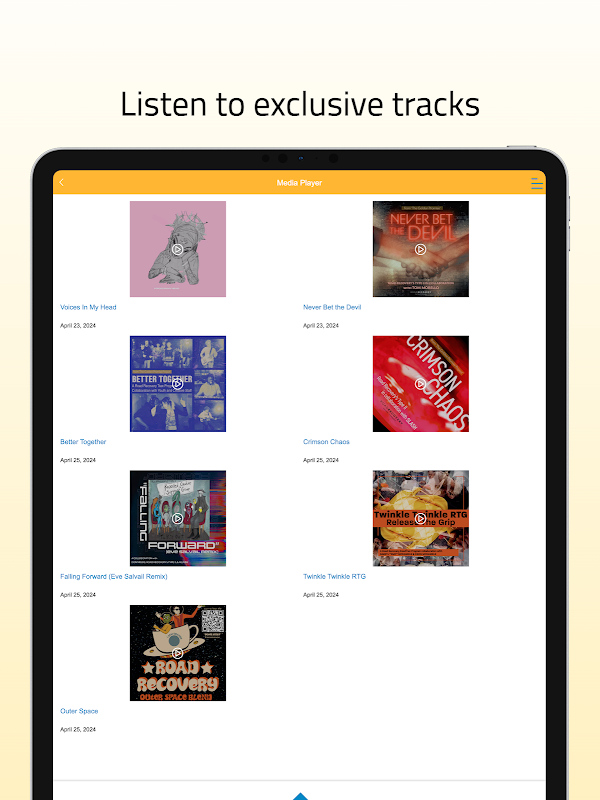 কিংবদন্তি সঙ্গীত শিল্পীদের সহযোগিতায় Trax প্রোগ্রামে তৈরি এবং রেকর্ড করা গান শুনতে প্লেয়ার ব্যবহার করুন। আসন্ন ফাইনাল, বিশেষ ইভেন্ট বা পরবর্তী মিউজিক রিলিজের খবর দেখতে প্রোগ্রাম ইভেন্ট অ্যাক্সেস করুন।