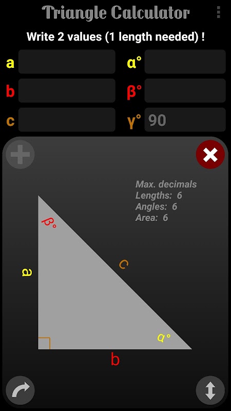 ত্রিকোণমিতি দ্বারা, দৈর্ঘ্য এবং কোণগুলি একটি সমকোণী ত্রিভুজ জন্য গণনা করা হয় যখন কেবলমাত্র দুটি মান জানা যায় (কমপক্ষে একটি দৈর্ঘ্য হতে হবে)। ত্রিভুজের ক্ষেত্রফল এবং পরিধিও গণনা করা হয়।