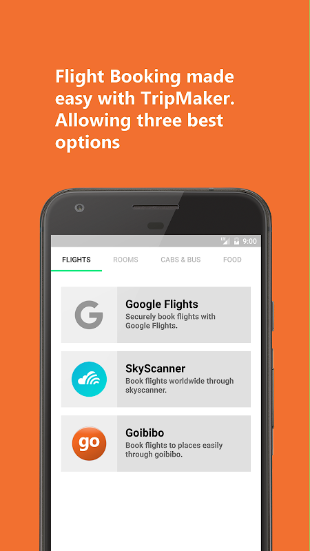 TripMaker is an app combined with sites which enables flight booking, hotels and rooms booking, cabs and bus booking and even food services. All the services are assured to be available in India and most countries. This app helps you plan trips and make your trips go smooth on the go. Book rooms and flights that just makes your trip choose from three varieties. If you want to book at the moment you reach that place, its completely fine, just book through this app.