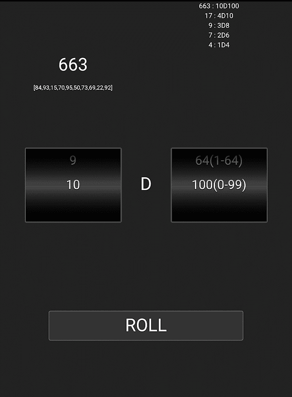 ダイスの個数と種類をスワイプで選択してROLLボタンを押すだけでロール結果がわかります。