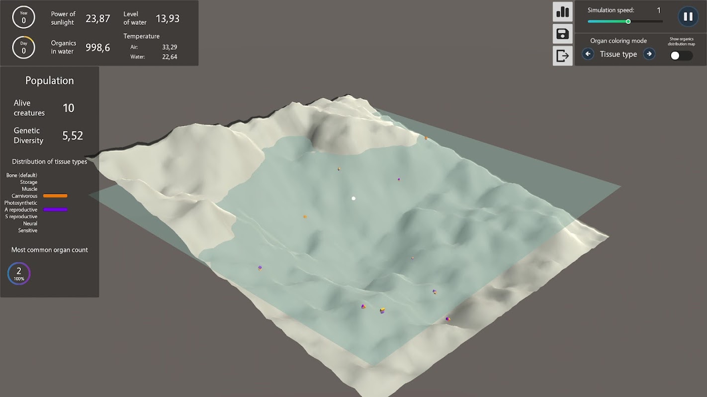 কোন পরিবেশে সিমুলেশন সঞ্চালিত হয়? একটি এলোমেলোভাবে উত্পন্ন বর্গাকার আকৃতির ল্যান্ডস্কেপ আছে, যার বাইরে প্রাণীরা বের হতে পারবে না। এটি সূর্য দ্বারা আলোকিত হয়, দিন রাতে পরিণত হয়। সালোকসংশ্লেষণ দ্বারা উত্পাদিত সৌর শক্তি সূর্যের উজ্জ্বলতার উপর নির্ভর করে। এবং সূর্যের উজ্জ্বলতা, ঘুরে, দিনের সময় এবং বছরের সময়ের উপর নির্ভর করে। বিশ্বের কিছু অংশ জলে আচ্ছাদিত, যার স্তর পর্যায়ক্রমে পরিবর্তিত হয় (জোয়ার ঘটে)। প্রাথমিকভাবে, একটি নির্দিষ্ট পরিমাণ জৈব পদার্থ (অণুজীব বা সহজভাবে জৈব অণু) জলে দ্রবীভূত হয়, যা হেটেরোট্রফগুলির জন্য শক্তির উত্স হিসাবে কাজ করতে পারে। জৈব পদার্থ জলের আয়তনে বিতরণ করা হয় যাতে এর ঘনত্ব অভিন্ন হয়। যাইহোক, এটি একটি নির্দিষ্ট গতিতে (প্রসারণের হার) এবং শুধুমাত্র জলের একটি বদ্ধ আয়তনের মধ্যে চলতে পারে (একটি জলাধার থেকে জৈব পদার্থ অন্য জলাধারে প্রবাহিত হতে পারে না যদি তারা ভূমি দ্বারা পৃথক হয়)।