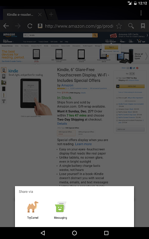 Send an Amazon url to CamelCamelCamel. Simply use the Android share action in a web browser (or any other app) and select TryCamel. You will be taken to the CamelCamelCamel page for that Amazon item.
