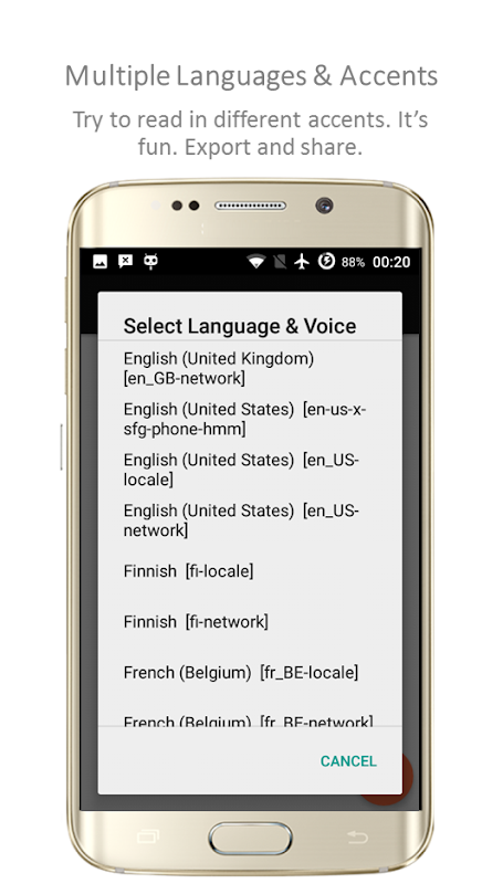 একবার আপনি (অধিকাংশ ডিভাইসের ডিফল্ট ভাষা ডিফল্ট দ্বারা ডাউনলোড করা আছে) ডাউনলোড ভাষা আছে - এবং আপনি আপনার লেখা আছে, TTSReader সম্পূর্ণরূপে অফলাইন কাজ করে.