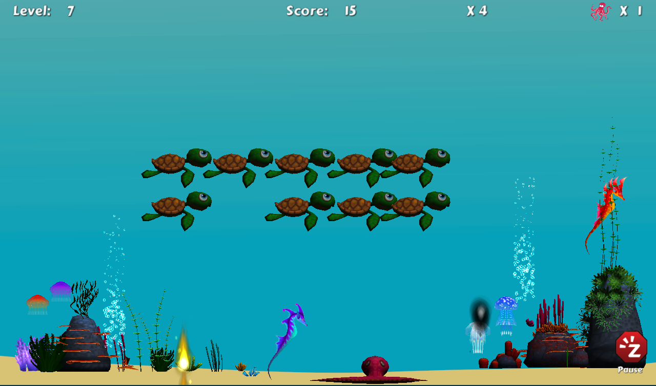 The turtles have decided to take over the underwater Aqua world. The fearless Octoremus has decided to fight back!! In order to stop the turtles, Octoremus must ink the turtles, which magically transport them back to their own lair. The turtles, of course, can fight back.