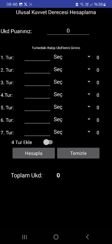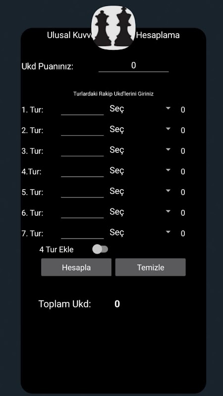 দাবায়, প্রতিটি ক্রীড়াবিদ একে অপরের উপর তাদের শ্রেষ্ঠত্ব প্রদর্শনের জন্য একটি জাতীয় শক্তি রেটিং (NCD) গণনা করা হয়। এই UKD প্রতিটি অফিসিয়াল ম্যাচ এবং টুর্নামেন্টের পরে গণনা করা হয়। এটি মাসের শুরুতে ঘোষণা করা হয়। এই অ্যাপ্লিকেশনটির জন্য ধন্যবাদ, মাসের শুরুতে ঘোষণা করার আগে আপনি টুর্নামেন্ট থেকে প্রাপ্ত আপনার জাতীয় শক্তি রেটিং (UKD) স্কোর সহজেই খুঁজে পেতে পারেন। এটি একটি 11-রাউন্ড টুর্নামেন্টের জন্য ডিজাইন করা হয়েছে।