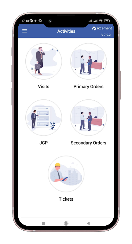 অ্যাপ্লিকেশনের ভিতরে, তাদের গ্রাহকদের (অ্যাকাউন্ট) তালিকা রয়েছে যারা মূলত প্রভাবশালী এবং সাইট। তাদের পরিদর্শনগুলি হল জেসিপি যা মাসের শুরুতে পরিকল্পনা করা হয় এবং যে কোনও সময় অ্যাডহক তৈরি করা যেতে পারে।