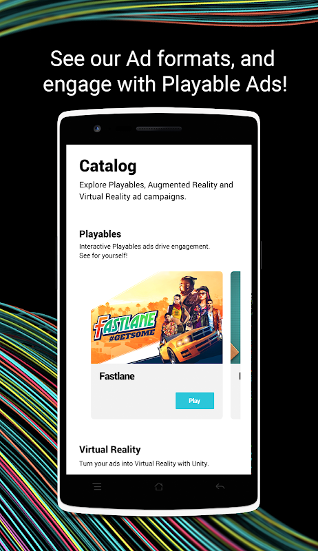 The Unity Ads Showcase app demonstrates how Unity’s platform can create compelling AR, VR, and Playable ads and interactive experiences to drive engagement and excitement for your brand.