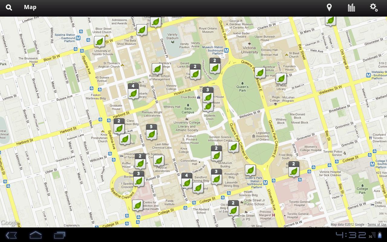 This Google-based, layered map designed for the Android helps members of the U of T community, particularly people who are new to the campus, navigate using meaningful search words, such as "library" and "registrar". The first map layers include accessibility, food, wireless, student services (including registrars), car parking, bike racks, TTC subway stations, green sites (including green roofs and battery drop-off sites), safety, study spaces and washrooms. It is a living map, one that will develop more layers as it grows.