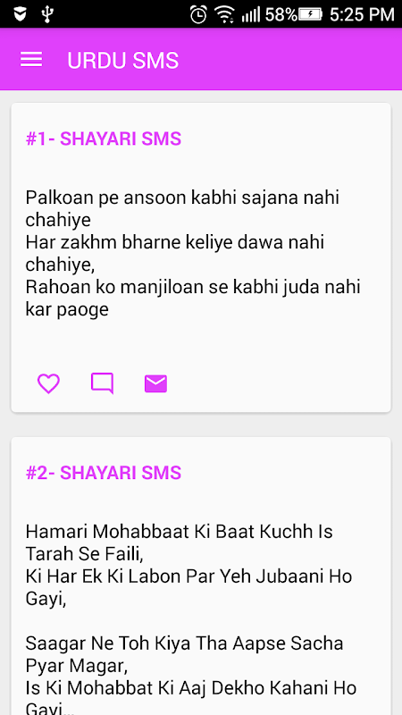 এই উর্দু এসএমএস কবিতা অ্যাপে আপনি অনেক ধরনের কবিতা পাবেন। উর্দু এসএমএস কবিতা বিভিন্ন বিভাগের জন্য বিশাল সংগ্রহ। আপনি সোশ্যাল মিডিয়া প্ল্যাটফর্মে কবিতা পাঠাতে পারেন। নিম্নলিখিত কিছু বৈশিষ্ট্য