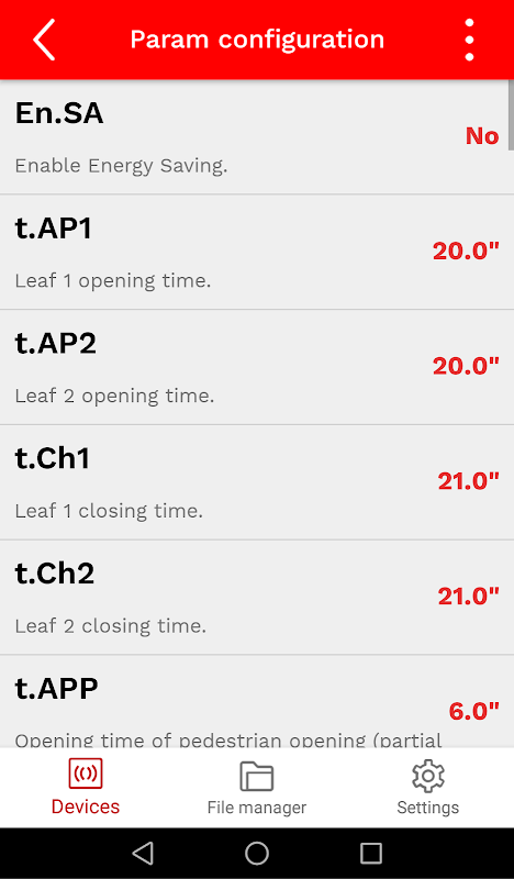 The App allows you to configure the different parameters of the control unit in a very simple and catchy way. With the App you can also load the default parameters of the control unit, as well as reading the current configuration or loading a previous one.