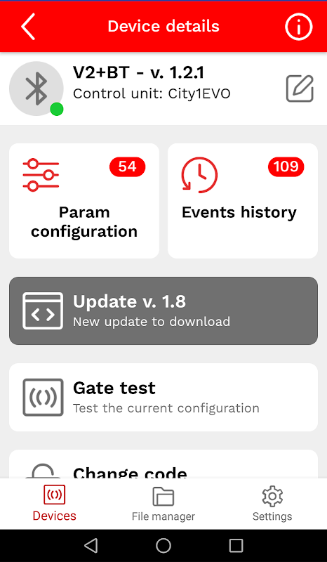 In addition, V2 APPTOOL gives you the chance to access directly the control unit’s event list (event code, description of the event, status of the gate at the moment the recorded event took place), and to download and install the new firmware releases for the control unit, while storing all your data on a dedicated Cloud service.