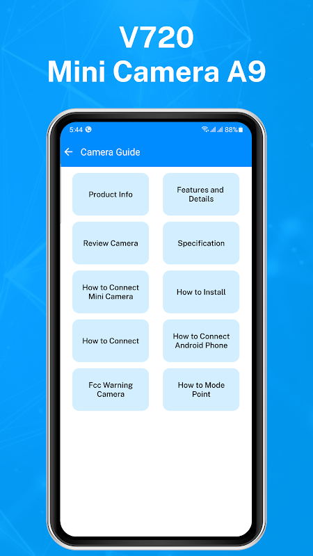 This mobile application is a guide. It is not an official app or part of an official app product. Download this guide to learn about V720 Mini Camera A9. This app is a guide that should be at hand for anyone with V720 Mini Camera A9. It does not belong to an official brand.