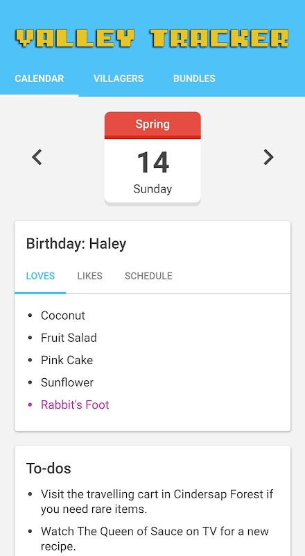 এটি স্টারডুই ভ্যালির জন্য একটি অননুমোদিত ডায়েরি / ট্র্যাকার যা আপনার জন্মদিন বা গুরুত্বপূর্ণ ইভেন্টটি মিস করবেন না তা নিশ্চিত করতে সহায়তা করে!