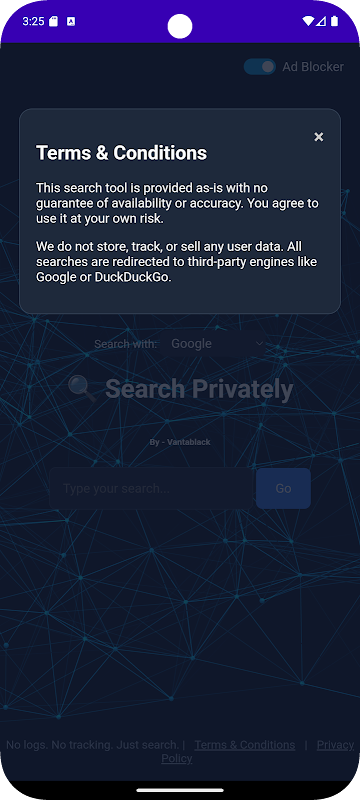 VantaBlack হল একটি গোপনীয়তা-কেন্দ্রিক সার্চ ইঞ্জিন যা ব্যবহারকারীদের জন্য নির্মিত যারা ট্র্যাক করা, প্রোফাইল করা বা নিরীক্ষণ করতে অস্বীকার করে। কোনো লগ ছাড়াই, কোনো কুকিজ নেই, এবং কোনো ব্যবহারকারীর ডেটা সংগ্রহ করা হয়নি — কখনও — VantaBlack একটি বিশুদ্ধ অনুসন্ধান অভিজ্ঞতা প্রদান করে যা আপনার ডিজিটাল স্বাধীনতাকে সম্মান করে। প্রতিটি ক্যোয়ারী আপনার তথ্য সঞ্চয় না করেই Google বা DuckDuckGo-এর মতো বিশ্বস্ত অনুসন্ধান প্রদানকারীদের কাছে নিরাপদে পুনঃনির্দেশিত হয়৷ একটি ন্যূনতম, অ্যানিমেটেড ইন্টারফেসে মোড়ানো, ভ্যানটাব্ল্যাক গতির সাথে নিরাপত্তাকে একত্রিত করে, আপনাকে ওয়েব অনুসন্ধান করার একটি মসৃণ এবং আধুনিক উপায় দেয়৷ আপনি আকস্মিকভাবে ব্রাউজ করছেন বা গভীরভাবে গবেষণা করছেন না কেন, আপনার গোপনীয়তা অটুট থাকে।