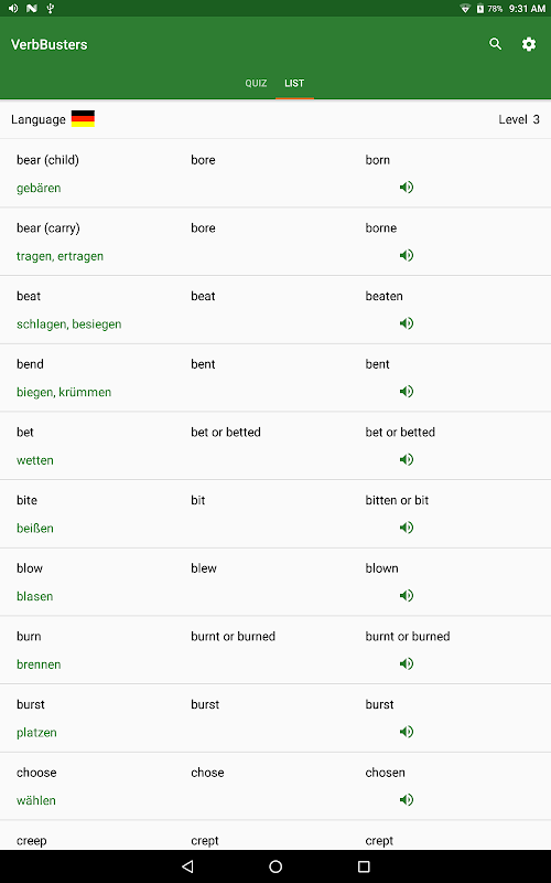 নেটিভ ভাষার অনুবাদ সহ ক্রিয়া তালিকাগুলি প্রতিটি স্তরের জন্য সরবরাহ করা হয় এবং আপনি ইংরেজী বা আপনার স্থানীয় ভাষা ব্যবহার করে ডাটাবেসগুলি সন্ধান করতে পারেন এবং সর্বাধিক এবং কমপক্ষে সাধারণ অনিয়মিত ক্রিয়াগুলির মধ্যে প্রায় 180 এর উচ্চারণ শুনতে পারেন।