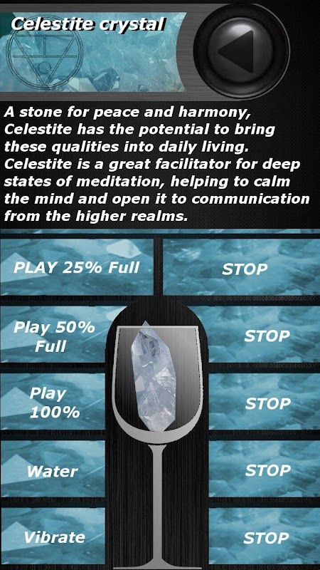 প্রতিটি স্ফটিকের নিজস্ব অনন্য শক্তি রয়েছে। আপনি যে শব্দগুলি শুনছেন সেগুলি স্ফটিকের, এটি স্ফটিক ওয়াইন গ্লাসে রাখা। তারপরে 25% - 100% থেকে বিভিন্ন স্তরের জলে পূর্ণ।
