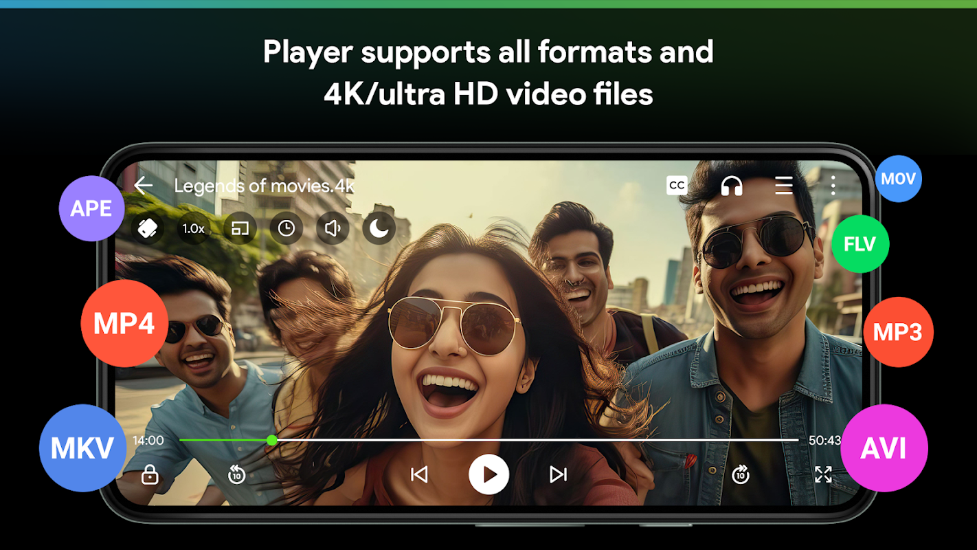 MP4, MKV, AVI, MOV, WMV, FLV, 3GP, M4V, VOB, MP3, WAV, FLAC সমর্থন করে – অতিরিক্ত কোডেক ছাড়াই যেকোন কিছু খেলুন।