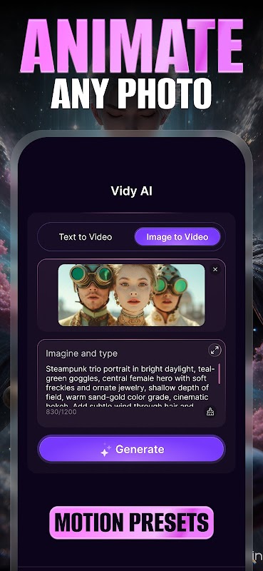 - চিত্র থেকে ভিডিও: আপনার ছবিগুলিকে মনোমুগ্ধকর ভিডিওতে রূপান্তর করুন। AI ভিডিও জেনারেটর প্রযুক্তির সাহায্যে, আপনার স্থির চিত্রগুলিকে গতিশীল এবং আকর্ষণীয় করে তুলুন।