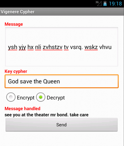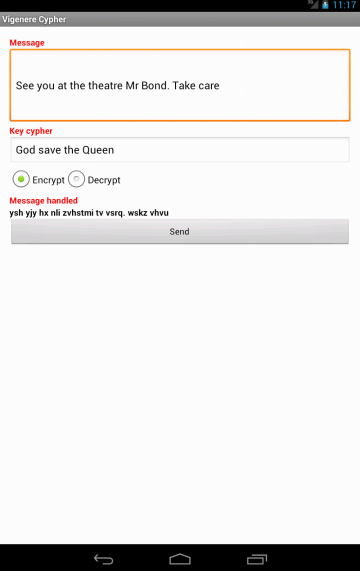Cette application permet d'échanger des messages cryptés par le chiffrement de Vigenere et de l'envoyer avec n'importe quelle application de votre appareil (SMS, mail, Viber, Whatsapp, Snap etc...).