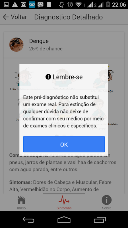 Para obter o pré-diagnóstico basta escolher a aba "Sintomas", marcar os sintomas que se está sentindo e clicar no botão "Diagnosticar" localizado no canto superior direito da tela. O aplicativo traz o percentual de chance de estar com uma doença que possua os mesmos sintomas informados pelo usuário.