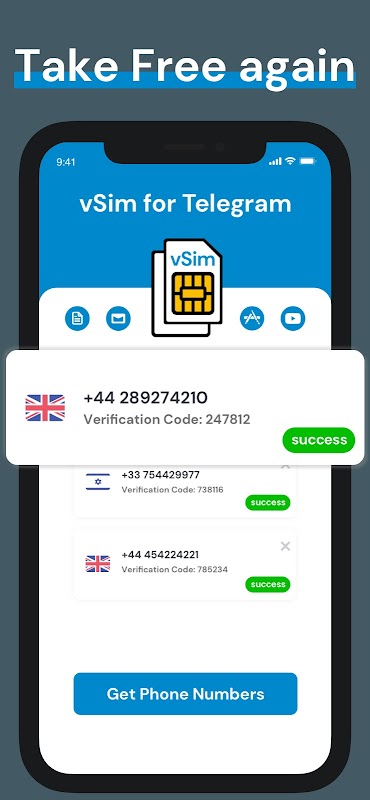 • vSim অ্যাপ টেলিগ্রামের সাথে কাজ করার গ্যারান্টিযুক্ত পরিষ্কার, ব্যক্তিগত, নন-রিসাইকেল ফোন নম্বর সরবরাহ করে।