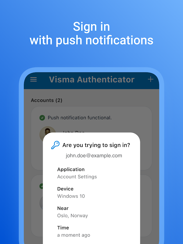 Visma Connect ব্যবহারকারীদের পুশ বিজ্ঞপ্তির মাধ্যমে সাইন-ইন অনুমোদন করার অনুমতি দেয়।