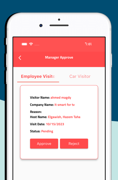 অ্যাপ্লিকেশন সাহায্য কোম্পানী তাদের ব্যবহারকারী ভিজিটর এবং যানবাহন দর্শনার্থীদের পরিচালনা করতে তাদের প্রাথমিক তথ্য দিতে পারে এবং ম্যানেজার এই ভিজিটটি অনুমোদন করতে পারে বা কারণ সহ এই ভিজিট প্রত্যাখ্যান করতে পারে।