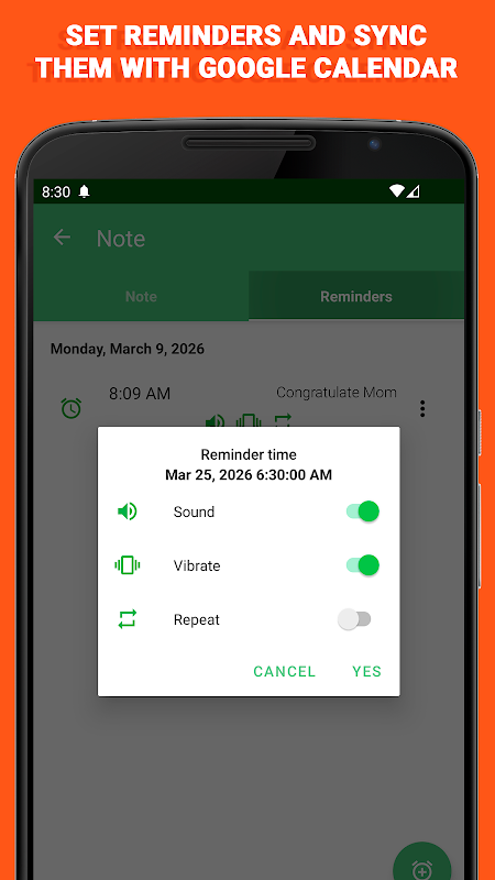 গুরুত্বপূর্ণ নোট জন্য অনুস্মারক তৈরি করুন: একটি সময় নির্বাচন করুন ও ইচ্ছা হলে তারপর, একটি অডিও সতর্কতায় কম্পন, বা পুনরাবৃত্তি অনুস্মারক চয়ন। আপনি সেটিংসে একটি অনন্য সতর্কতা শব্দ চয়ন এবং পুনরাবৃত্তি বিজ্ঞপ্তির জন্য সময় নির্দিষ্ট করতে পারেন।