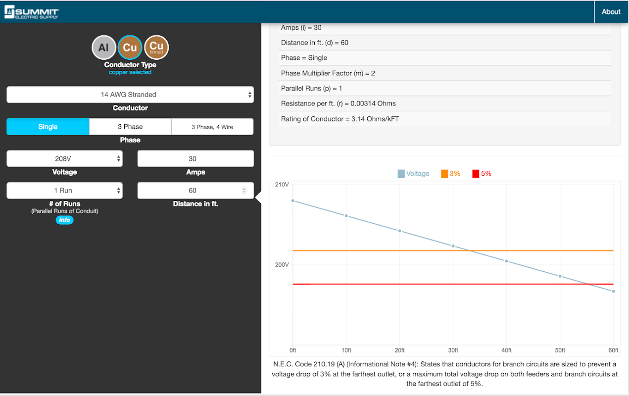 সামিট এর ভোল্টেজ ড্রপ ক্যালকুলেটর আপনি দ্রুত গণনা এবং একটি নির্বাচিত কন্ডাকটর আকার এবং টাইপ 2014 এনইসি উপর ভিত্তি করে শেয়ার ভোল্টেজ ড্রপ করতে সক্ষম হবেন. এই সহজ এবং সহজ-থেকে-ব্যবহার ক্যালকুলেটর যে কোনো আকারের কাজ বা প্রকল্পের জন্য পেশাদারী ফলাফল বিতরণ করে. কেবলমাত্র আপনার কন্ডাকটর নির্বাচন তারপর আপনার ভোল্টেজ, amperage, ফেজ, দূরত্ব, এবং রান সংখ্যা প্রবেশ করান নতুন ভোল্টেজ নির্ধারণ এবং শতাংশ কমে গেছে. আপনি প্রতিটি হিসাব যে ব্যবহৃত সূত্র সেইসাথে বিস্তারিত প্রযুক্তিগত তথ্য অন্তর্ভুক্ত জন্য তাত্ক্ষণিক ফলাফল পাবেন.