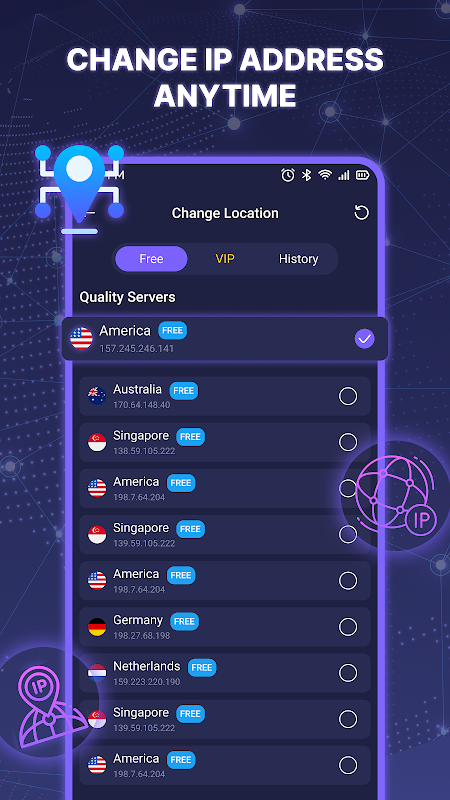 অ্যাপটি আপনাকে আপনার আইপি ঠিকানা দ্রুত এবং সহজে পরিবর্তন করতে দেয়, আপনাকে অনলাইন বেনামীর চূড়ান্ত স্তর প্রদান করে। এটি অনলাইনে আরও সুরক্ষা প্রদান করে কারণ এটি হ্যাকার এবং অন্যান্য দূষিত অভিনেতাদের জন্য আপনার ইন্টারনেট কার্যকলাপ ট্র্যাক করা কঠিন করে তোলে৷