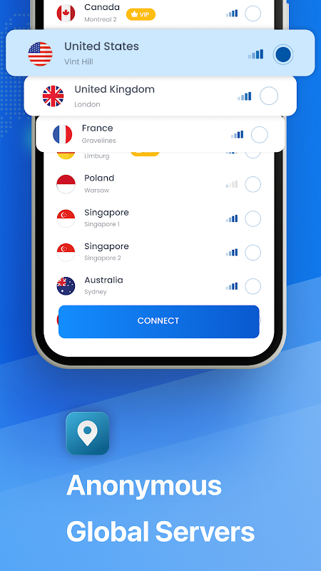 VPN প্রক্সি মাস্টার ব্যবহার করার সময়, আপনি বিশ্বের বিভিন্ন সার্ভারের সাথে সংযোগ করতে পারেন (সিঙ্গাপুর, কানাডা, মার্কিন যুক্তরাষ্ট্র, যুক্তরাজ্য, জার্মানি, ফ্রান্স, পোল্যান্ড...)