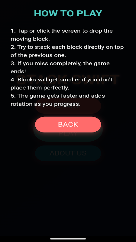 স্ট্যাক সুইফ্ট আপনার সময় এবং নির্ভুলতাকে চ্যালেঞ্জ করে যখন আপনি সম্ভাব্য সর্বোচ্চ টাওয়ার তৈরি করার চেষ্টা করেন। প্রতিটি ব্লক স্ক্রীন জুড়ে অনুভূমিকভাবে সরে যায়, এবং এটিকে পূর্ববর্তী ব্লকের উপরে সরাসরি স্থাপন করতে আপনাকে অবশ্যই সঠিক মুহূর্তে ট্যাপ করতে হবে। সামান্য মিস করুন এবং আপনার ব্লক ছোট হয়ে যাবে, ভবিষ্যতে স্ট্যাকিং আরও কঠিন করে তুলবে। সম্পূর্ণরূপে মিস এবং এটি খেলা শেষ!