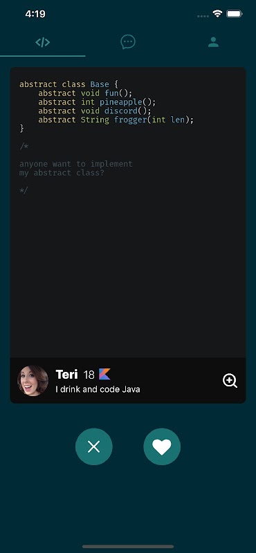 Meet other programmers that are looking for love and friendship. Instead of swiping on pictures of people, you swipe on their code :)