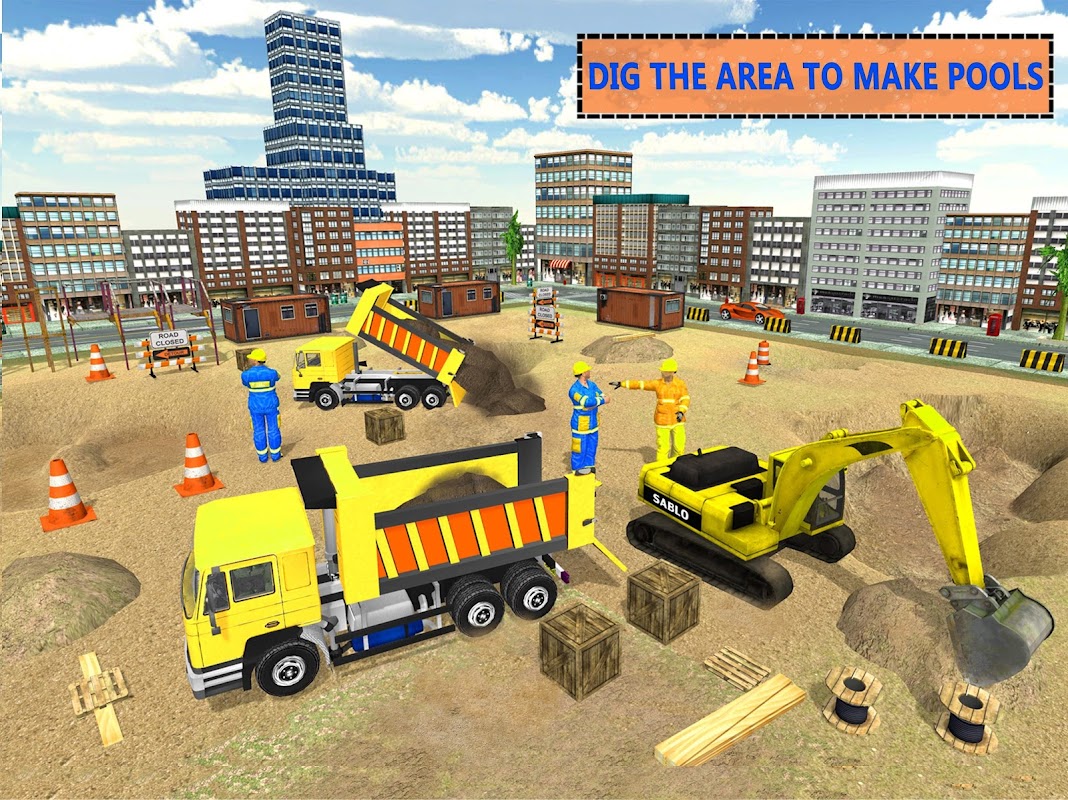 In this water slide simulator you have to build water slide of your own choice and also you can play on already made water slide. All processes of construction and simulation are dividing into 15 levels of building construction games 3d. The first task of building tycoon games is assigned to you is to dig the area by using excavator. In this level of builder simulation you will enjoy the ride of excavator. The next assigned task is to pick the tiles by using fork lifter and drive the fork lifter to construction area in best crafting game 2017.You need to pick tiles and place them in this mega city construction. You need not to worry about the placement of the tiles. The tiles will automatically place on already dig area in this mega city builder. In this work you need to drive the water tank and park it near the digging area in construction cargo. There will be placed a button you can click on that button and can fill the water tank in this water slide downhill. Then you need to drive loader in this home builder games. You have to pick the slabs by using tower crane and place them on stand. The next level is to place the stairs in this builder simulation. You will make the slide of your own choice in this uphill city construction. You have to take slide and collect coins to complete the level. The rest of the levels of these free building games will be like to take the slides and collect the coins.