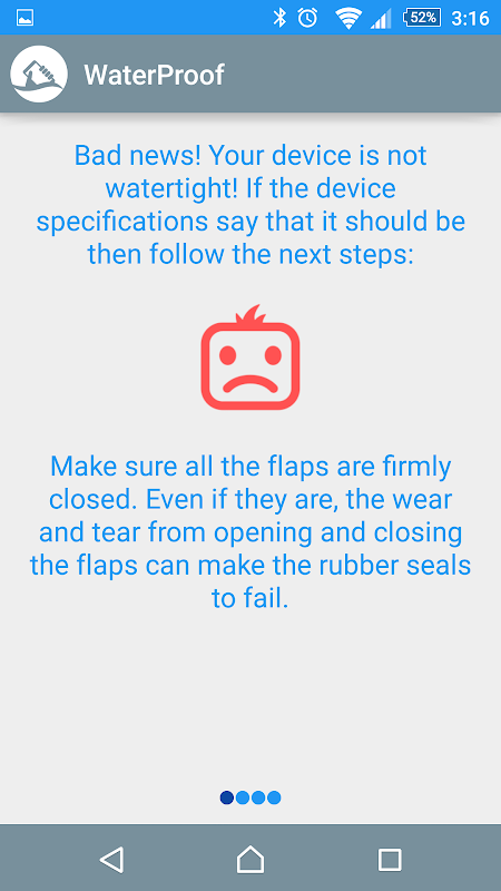 WaterProof can help you test if your phone is watertight. By applying simple physics and pressure sensor readings we determine if air can get out of your phone. If the test is positive it means that the phone is not watertight and you should not keep it close to water hazards. If the test is negative however then you have a good chance to have a good functional phone after you get out of the water.