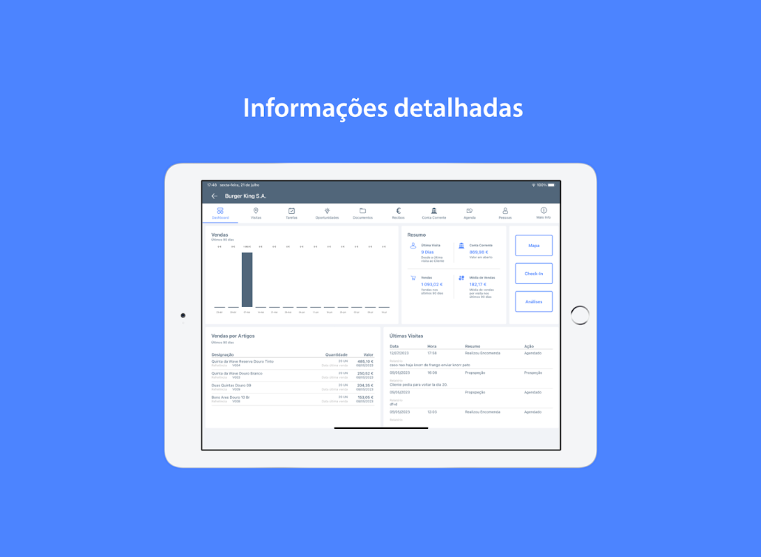 এটি আপনাকে গ্রাহকের ফাইল, নিবন্ধ, বর্তমান অ্যাকাউন্টের বিবৃতি, বিক্রয়ের ইতিহাস এবং বিক্রয়কর্মীর কার্যকলাপ সম্পর্কিত আর্থিক বিশ্লেষণের বিস্তারিত তথ্য অ্যাক্সেস করার অনুমতি দেয়, যেখানে আপনার কোম্পানির ব্যবস্থাপনা সফ্টওয়্যারের সাথে স্থায়ীভাবে সিঙ্ক্রোনাইজ করা থাকে।