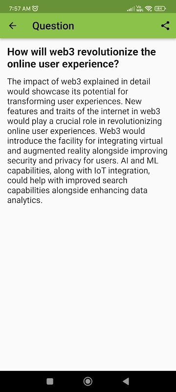Web3 সাক্ষাত্কারের প্রশ্ন: Web3 তে বিশেষভাবে আগ্রহীদের জন্য, আমাদের অ্যাপটিতে Web3 ধারণার উপর দৃষ্টি নিবদ্ধ করা 100+ প্রশ্নগুলির সাথে একটি উত্সর্গীকৃত বিভাগ রয়েছে। আপনার জ্ঞানকে আরও গভীর করুন এবং Web3 ইন্টারভিউতে আপনার আত্মবিশ্বাস বাড়ান।