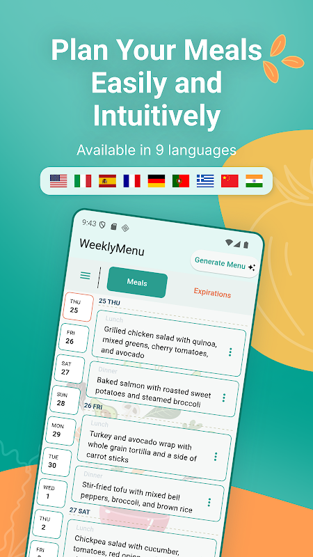 আপনার নিজের ভাষায় খাবারের পরিকল্পনা করা সহজ। অ্যাপটি ইংরেজি, ইতালীয়, ফ্রেঞ্চ, জার্মান, স্প্যানিশ, পর্তুগিজ, হিন্দি, গ্রীক এবং চীনা ভাষায় উপলব্ধ।