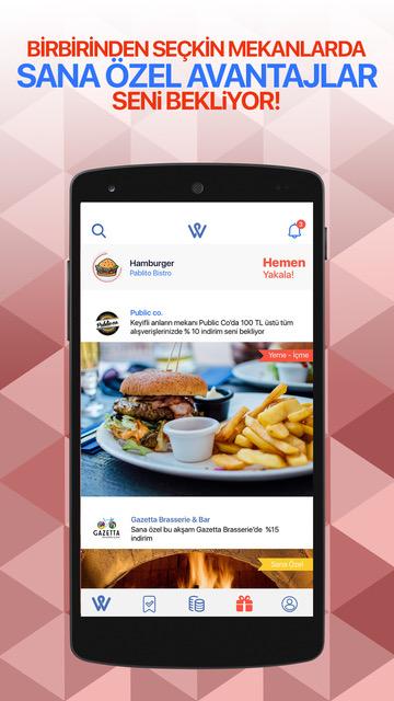 WeR ile indirimleri takip et. Mekanların anlık olarak tanımladığı indirimleri kaçırma. İndirimlerden yararlanmak için yapmanız gereken sadece hesabınızı öderken mobil uygulamanızda size özel üretilen kodu mekan yetkilisine göstermek. Mekan yetkilisi kodunuzu okutarak hesabınıza indirimi anında uygulayacaktır.