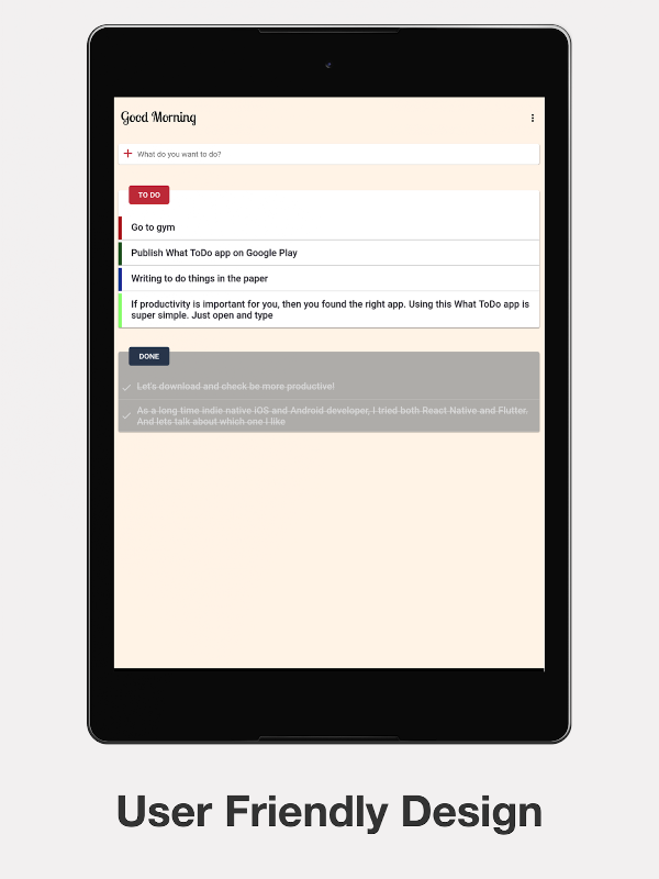WhatDo একটি টাস্ক ম্যানেজমেন্ট অ্যাপ্লিকেশন। এটা কাজ সম্পন্ন ধারণা ব্যবহার করে উন্নত করা হয়। এই অ্যাপ্লিকেশন যারা minimalist পদ্ধতির ভালবাসা জন্য।