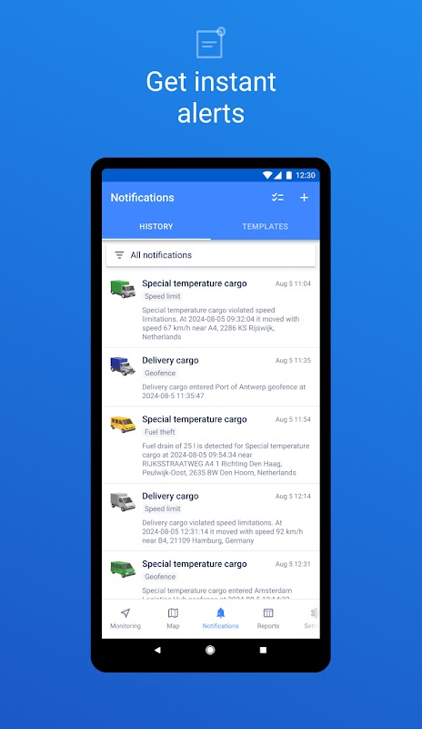 - তথ্যবহুল প্রতিবেদন। তাৎক্ষণিক সিদ্ধান্ত নেওয়ার জন্য ট্রিপ, স্টপ, ফুয়েল ড্রেন এবং ফিলিংস সম্পর্কে বিস্তারিত ডেটা ব্যবহার করুন।