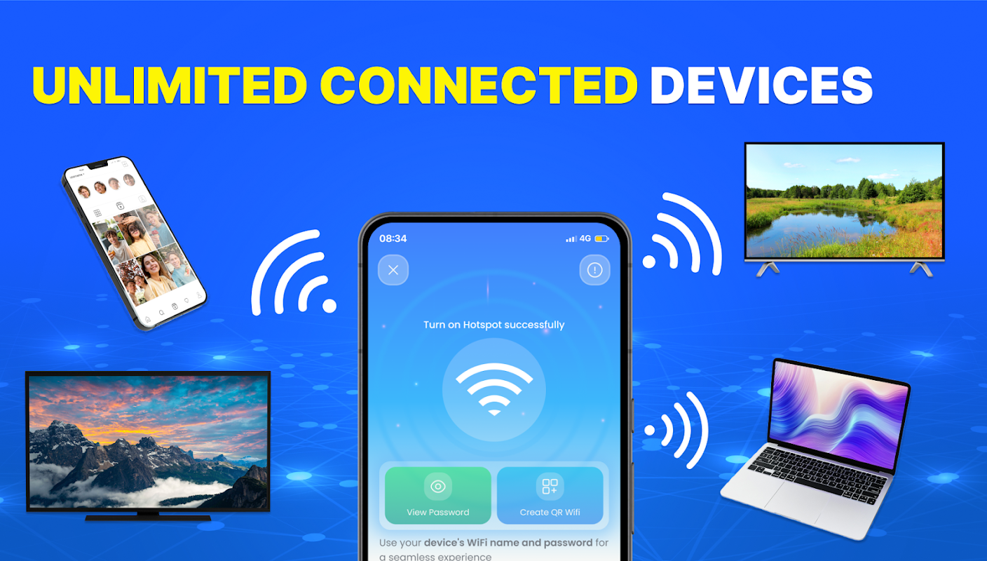 1. ওয়াইফাই হটস্পট এবং স্পিড টেস্ট অ্যাপ আপনার কম্পিউটার, ল্যাপটপ, ট্যাবলেট, ফোন বা Wi-Fi সমর্থন করে এমন যেকোনো ডিভাইসের জন্য মোবাইল সোশ্যাল নেটওয়ার্কিংয়ের অনুমতি দেবে।