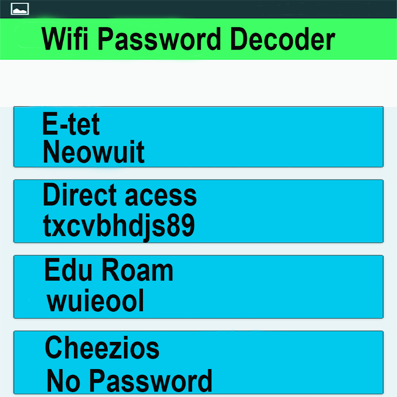 ওয়াইফাই পাসওয়ার্ড ডিকোডার একটি ওয়াইফাই হ্যাকিং অ্যাপ্লিকেশন নয়। এটা শুধুমাত্র আরাম সঙ্গে হারিয়ে ওয়াইফাই পাসওয়ার্ড দেখায়। এটা কাজ করার জন্য রুট এক্সেস প্রয়োজন।