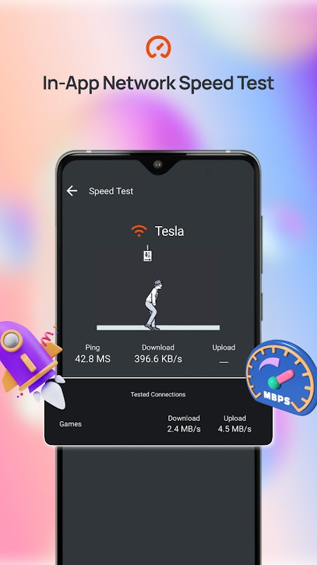 অ্যাপ থেকে প্রস্থান করার প্রয়োজন ছাড়াই একটি আঙুলের ট্যাপ দিয়ে সংযুক্ত ইন্টারনেটের গতি পরীক্ষা করুন!
